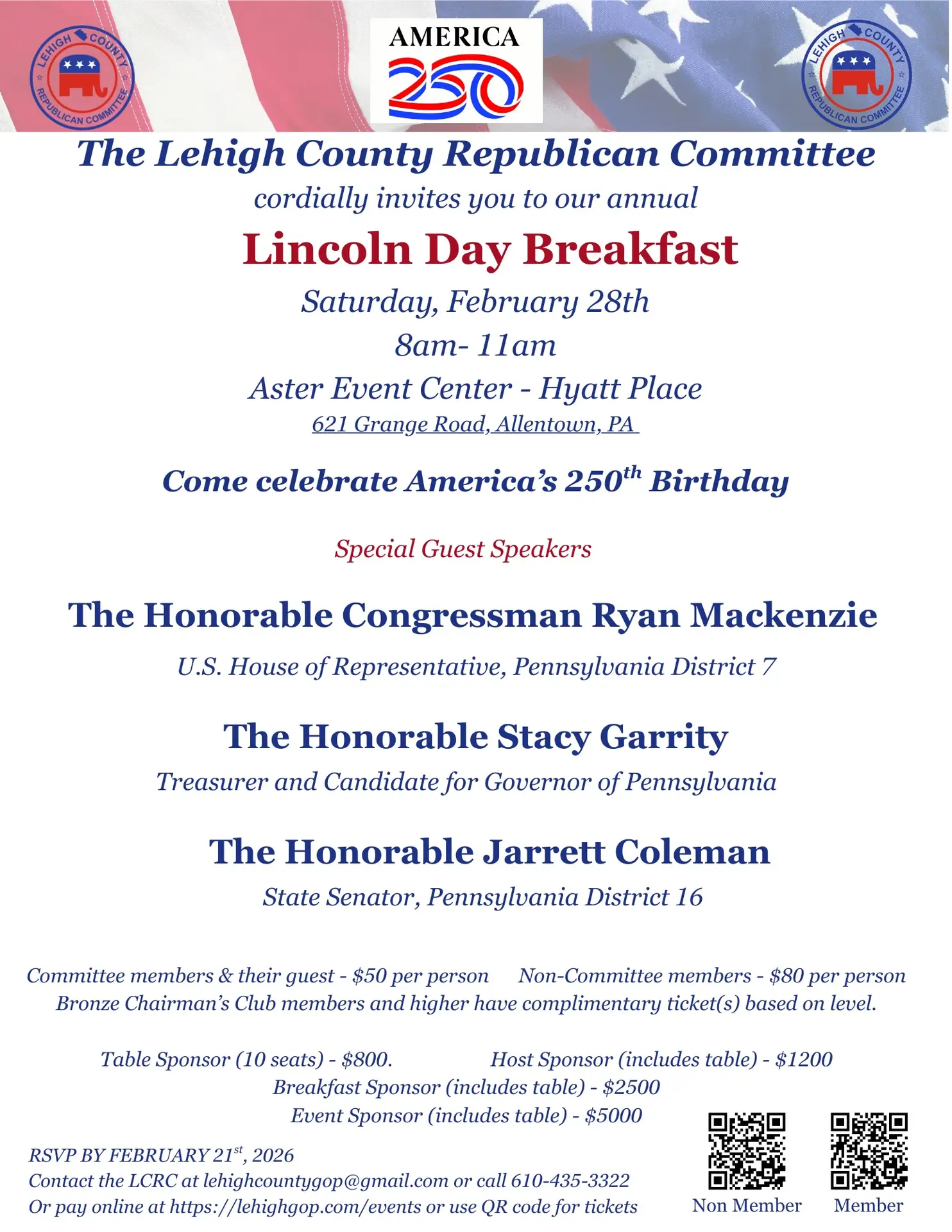 Lincoln Day BreakfastSaturday, February 28th8:00 AM – 11:00 AM Aster Event Center – Hyatt Place621 Grange Road, Allentown, PA Come celebrate America’s 250th birthday Special guest speakers: The Honorable Congressman […]