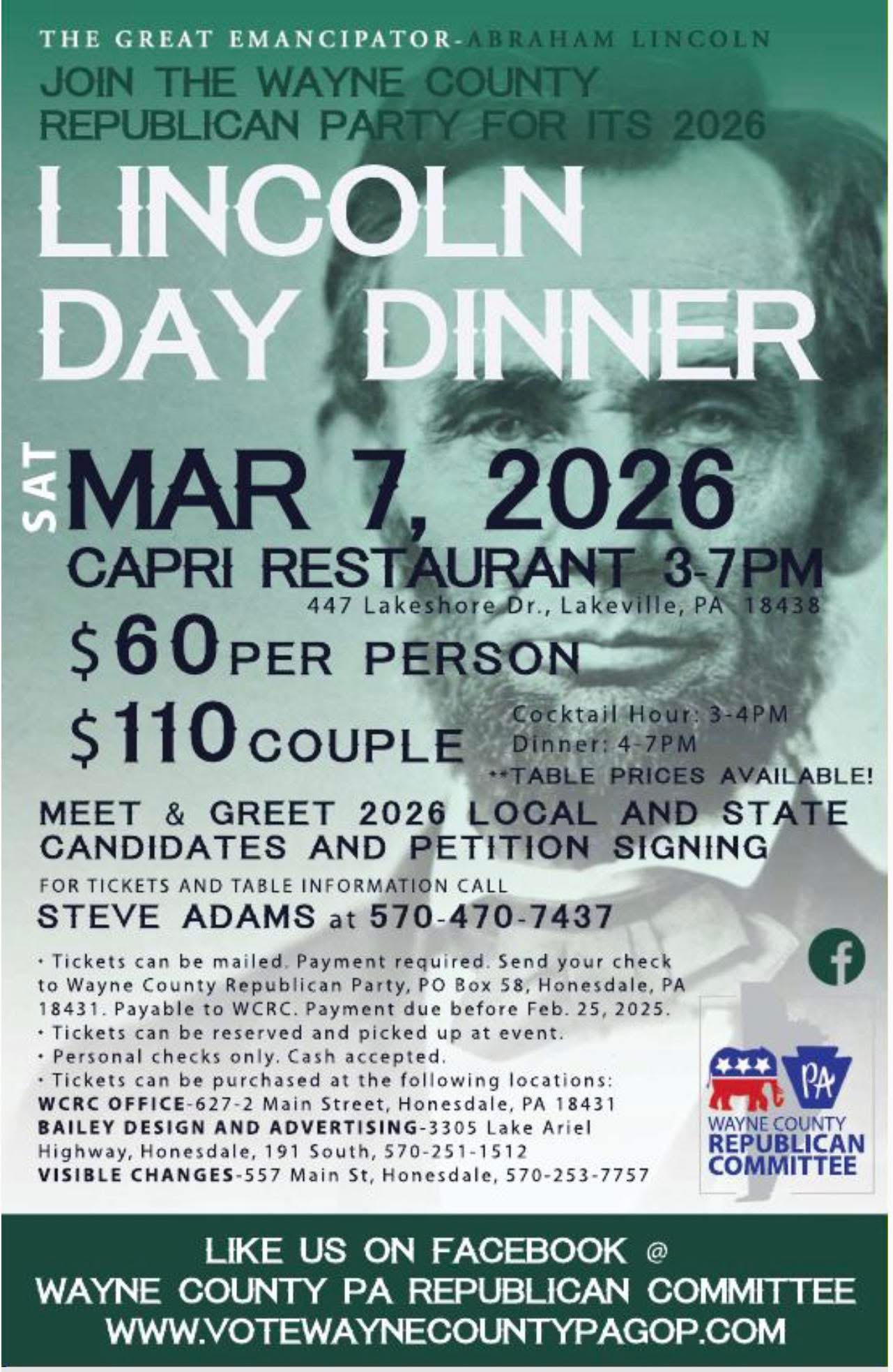 Cambria County Lincoln Day Dinner Thursday April 9th 2026Carrolltown Banquet Hall148 South Main StCarrolltown PA 5-6 Meet and Greet Dinner 6-?