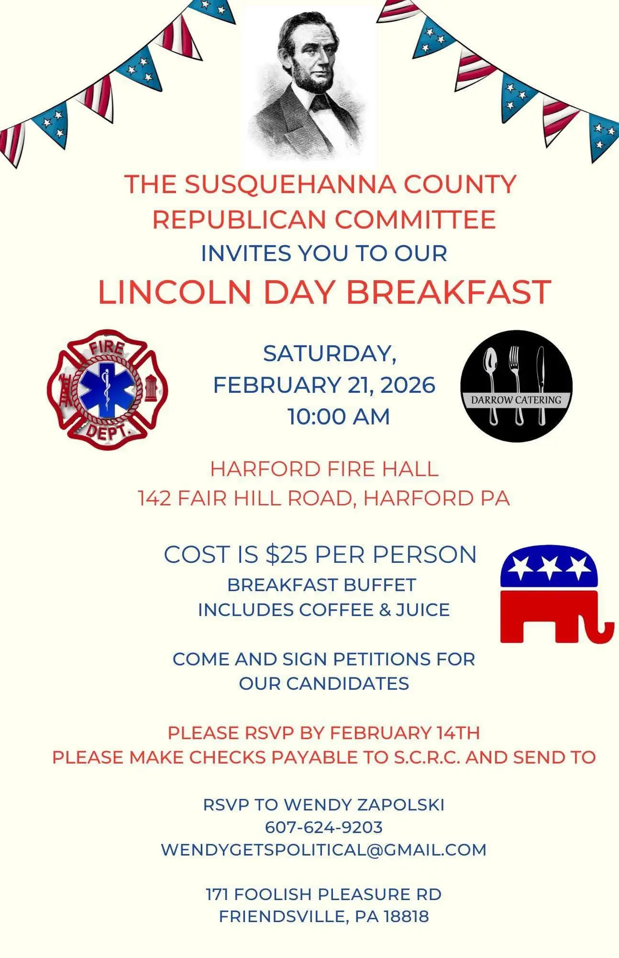 Harford Fire Hall | 142 Fair Hill Road, Harford, PA Cost is $25 per person Breakfast buffet includes coffee & juice Come and sign petitions for our candidates Please RSVP […]
