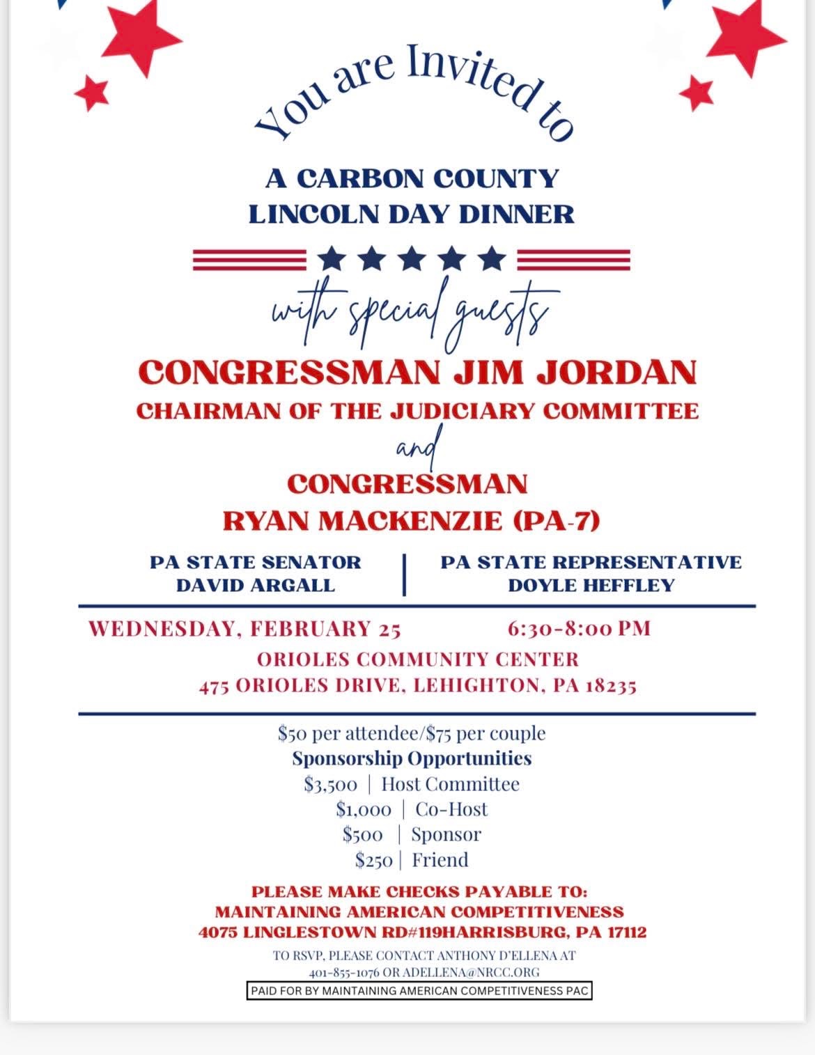 You are invited to A Carbon County Lincoln Day Dinner with special guestsCongressman Jim JordanChairman of the Judiciary Committee and Congressman Ryan Mackenzie (PA-7)PA State Senator David ArgallPA State Representative […]