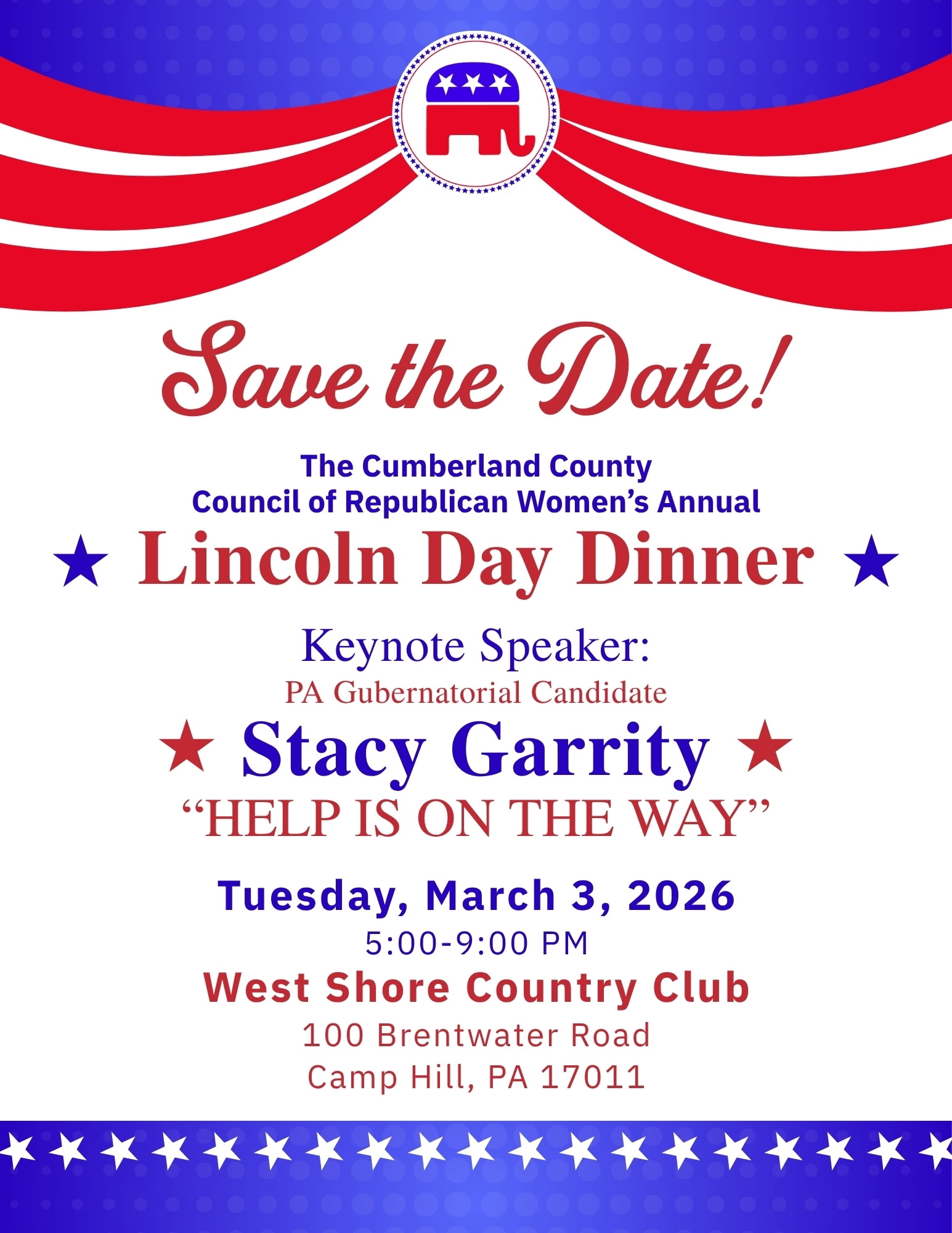 Keynote speaker:PA gubernatorial candidateStacy Garrity “Help is on the way” Tuesday, March 3, 20265:00–9:00 PM West Shore Country Club100 Brentwater RoadCamp Hill, PA 17011