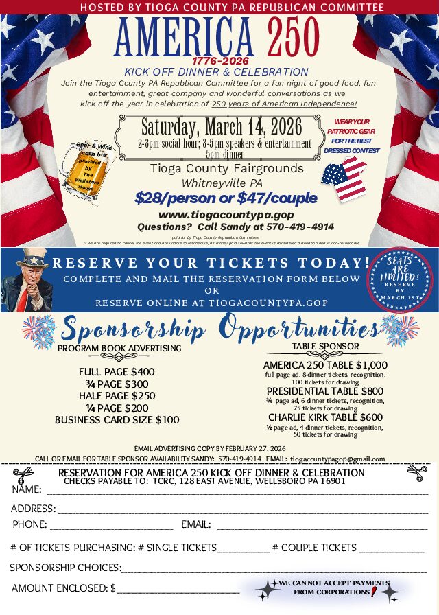 America 250 Kick Off Dinner & Celebration Hosted by the Tioga County PA Republican Committee Join the Tioga County PA Republican Committee for a fun night of good food, entertainment, […]