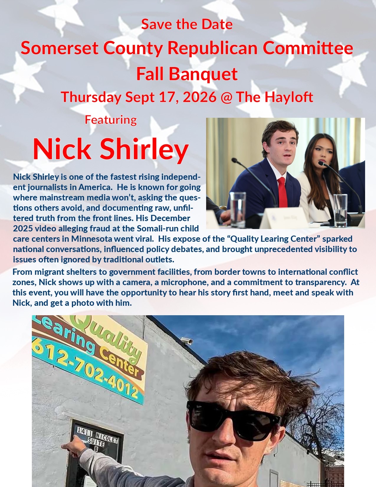 Save the Date Somerset County Republican Committee Fall Banquet Thursday, Sept 17, 2026 @ The Hayloft Featuring Nick Shirley Nick Shirley is one of the fastest rising independent journalists in […]