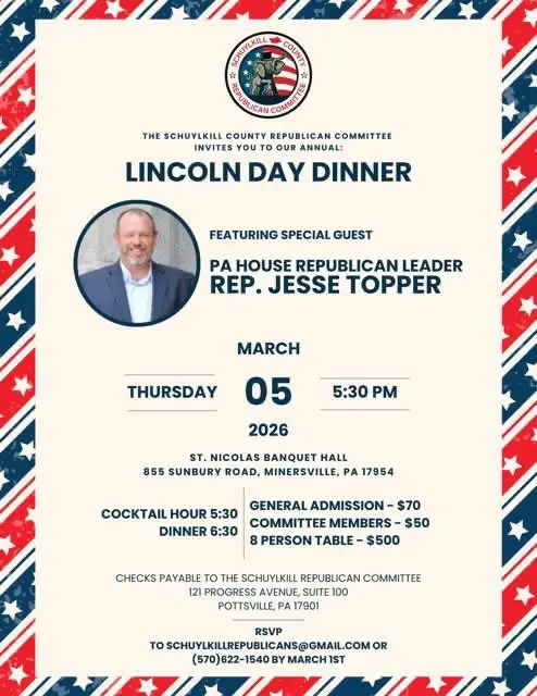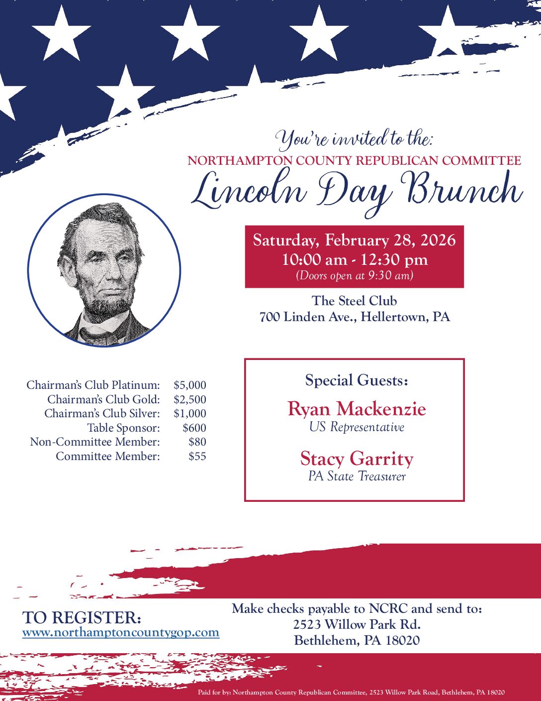 You are invited to A Carbon County Lincoln Day Dinner with special guestsCongressman Jim JordanChairman of the Judiciary Committee and Congressman Ryan Mackenzie (PA-7)PA State Senator David ArgallPA State Representative Doyle Heffley Wednesday, February 256:30–8:00 PM Orioles Community Center475 Orioles DriveLehighton, PA 18235 $50 per attendee$75 per couple Sponsorship opportunities: $3,500 host committee$1,000 co-host$500 sponsor$250 […]